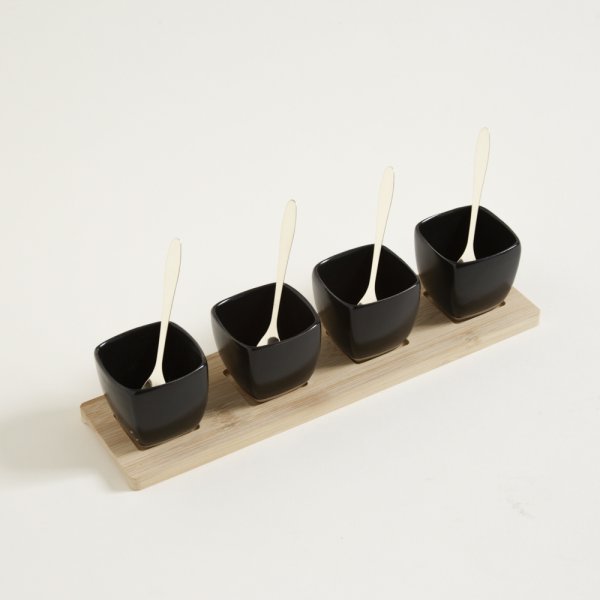 Set x 4 copetineros cuadrados de cerámica negra en base de bamboo, Incluye cucharitas en color dorado. Idales para servir pequeñas porciones de salsas, aderezos u otros acompañamientos.