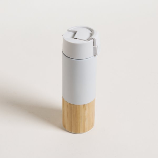 Botella de acero inoxidable doble capa color blanco mate, con cierre click y detalle en bamboo.