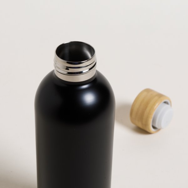 Botella de acero inoxidable doble capa color negro mate, con tapa de bamboo.