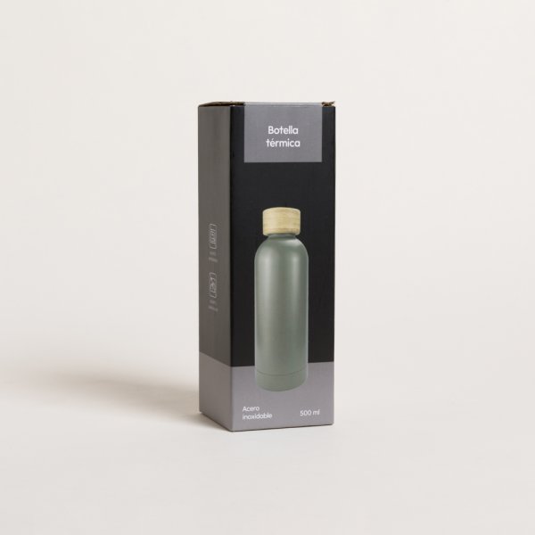 Botella de acero inoxidable doble capa color visón mate, con tapa de bamboo.