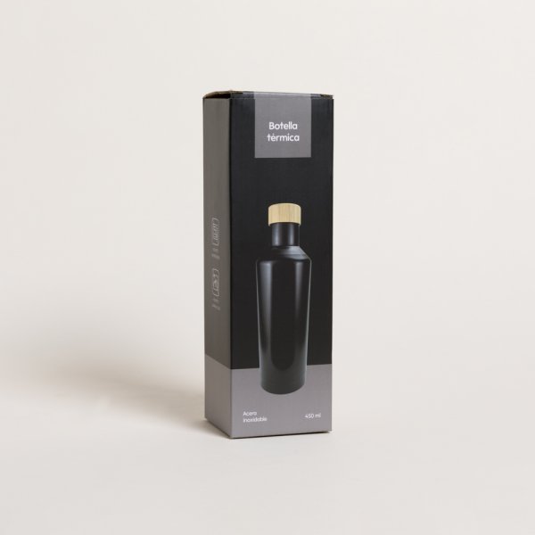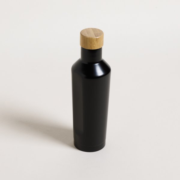 Botella de acero inoxidable doble capa color negro mate, con tapa de bamboo.