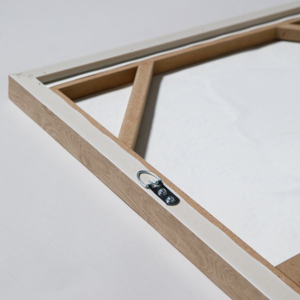 . Estructura de mdf, marco de poliestireno, lienzo de poliester, decoracion de yeso, pintura de acrilico, ganchos para colgar de acero.