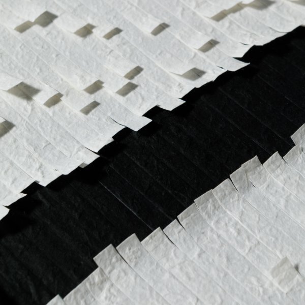 . Diseño en papel, marco de madera y ganchos colgantes de acero.