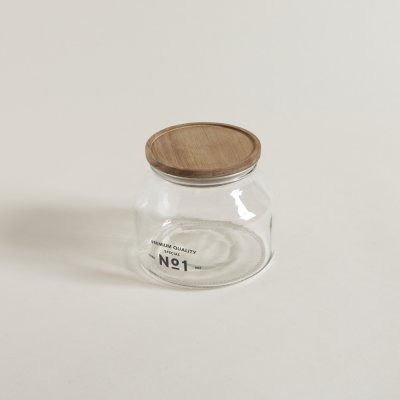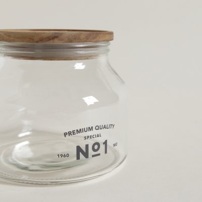 Frasco redondo de vidrio acanalado con tapa de madera acacia.