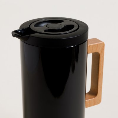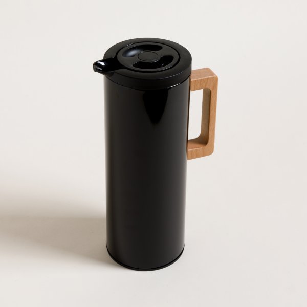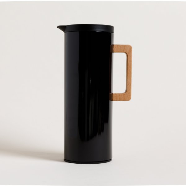 Jarra térmica metálica negra con acabado brillante, con ampolla de vidrio interna y asa de madera, de calidad Premium.