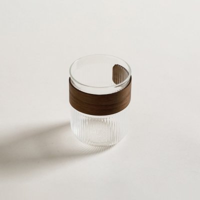 Mug de vidrio con diseño de finas rayas y guarda de madera.