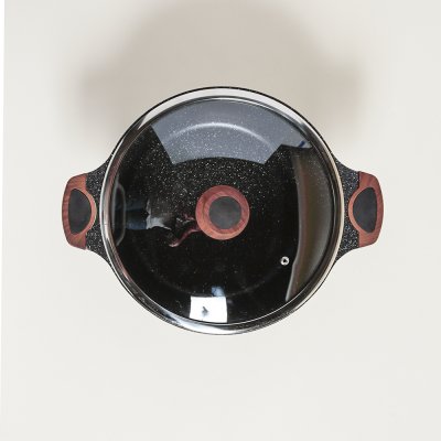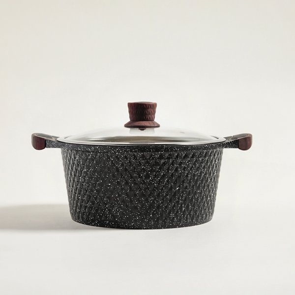 Olla de fundición de aluminio antiadherente con tapa de vidrio y asas con revestimiento de silicona.