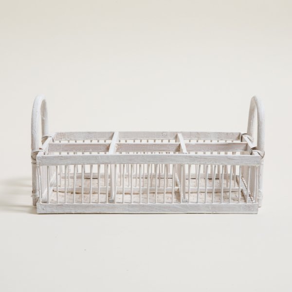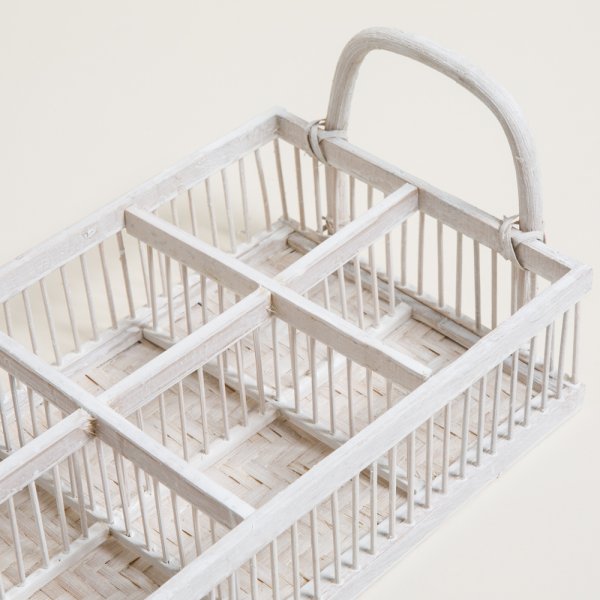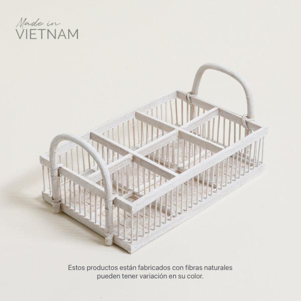 Organizador con 6 divisiones combinado en madera y fibra natural de color blanco.