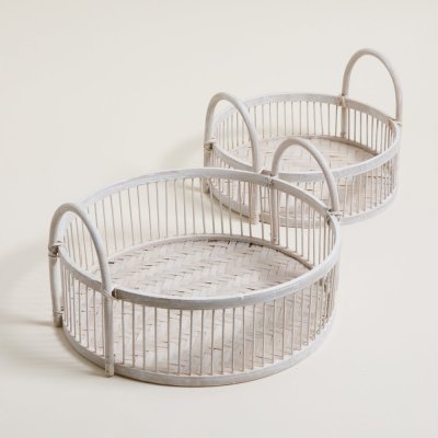 Set de bandejas redondas combinado en madera y fibra natural de color blanco.