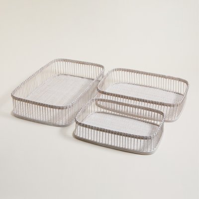 Set de bandejas rectangular combinado en madera y fibra natural de color blanco.