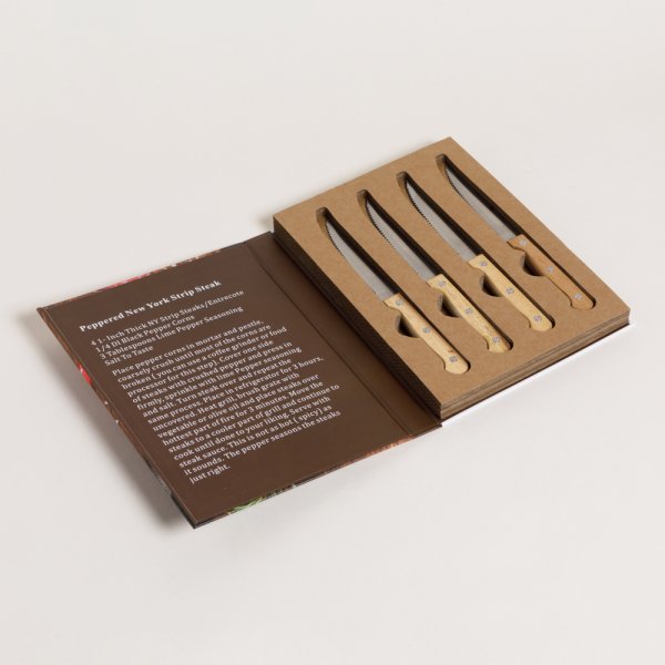 SET X 4 CUCHILLOS DE CARNE ACERO Y ACACIA 21,5 CM CON BOOK