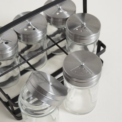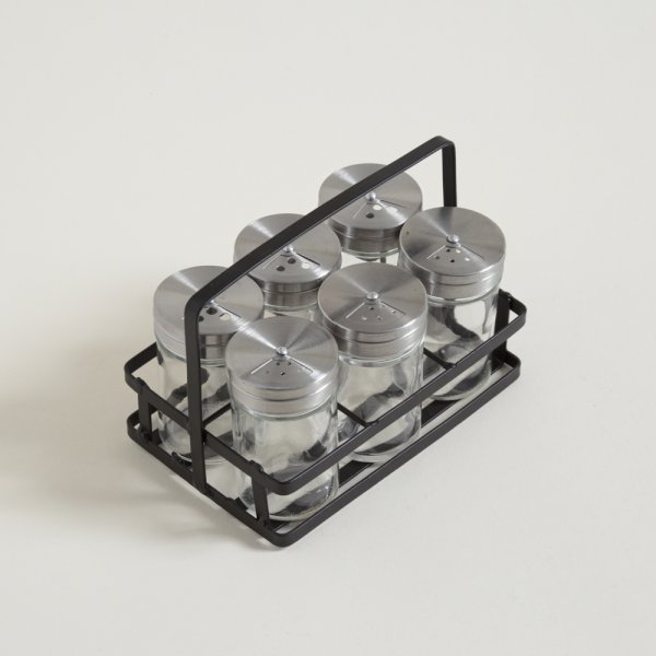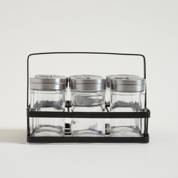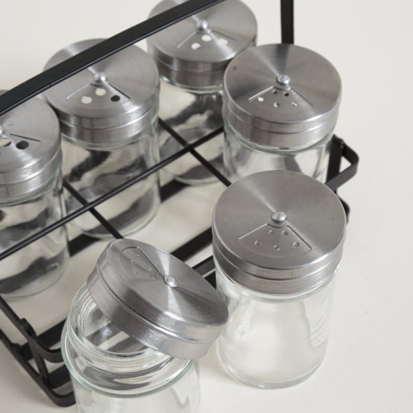Set x 6 especieros de vidrio con tapa de metal con dosificadores de 4 tamaños diferentes. Posee un soporte de metal negro con manija.