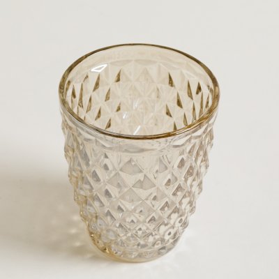 Set de vasos bajos hechos en vidrio prensado en color champagne.
