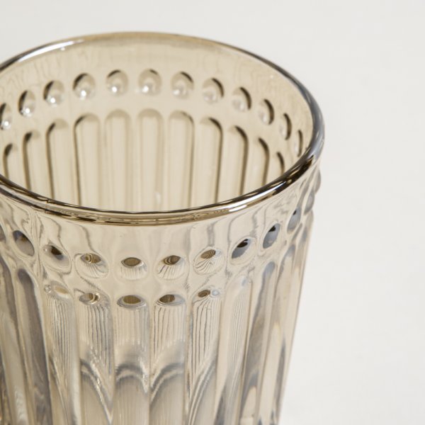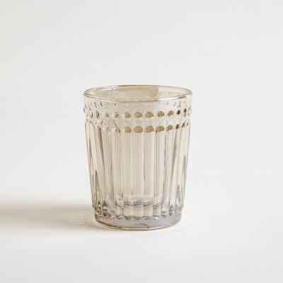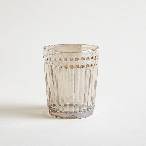 Set de vasos bajos hechos en vidrio prensado en color champagne.