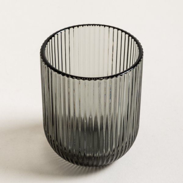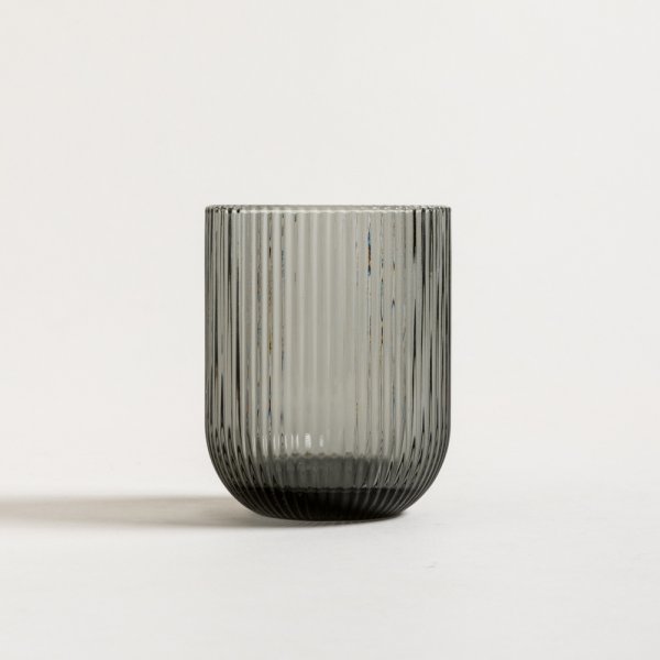 Set de vasos bajos de vidrio prensado color fume, con diseño de rayas verticales.