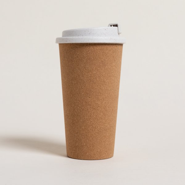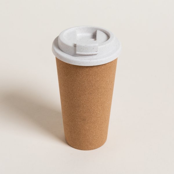 Vaso térmico alto color crema, con revestimiento de corcho y cierre click.